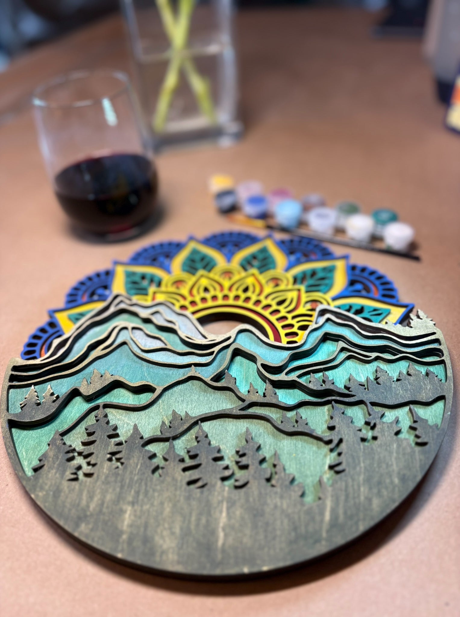 Create your own 4 layered wood art piece, no tools or prep needed! This kit features a stunning mountain landscape with a sun mandala rising behind it, designed to bring calm, creativity, and a bit of magic to your space.